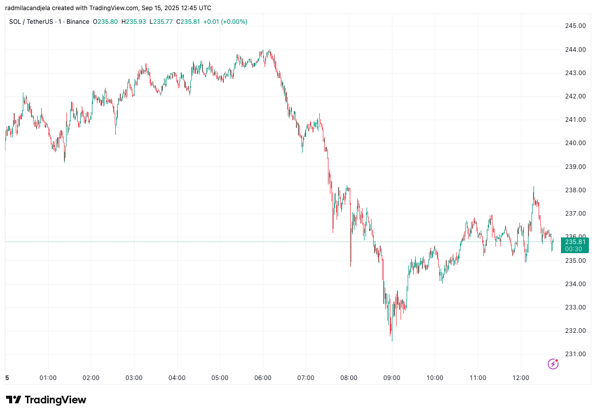 Solana dips 6.5% then trims losses to $236
