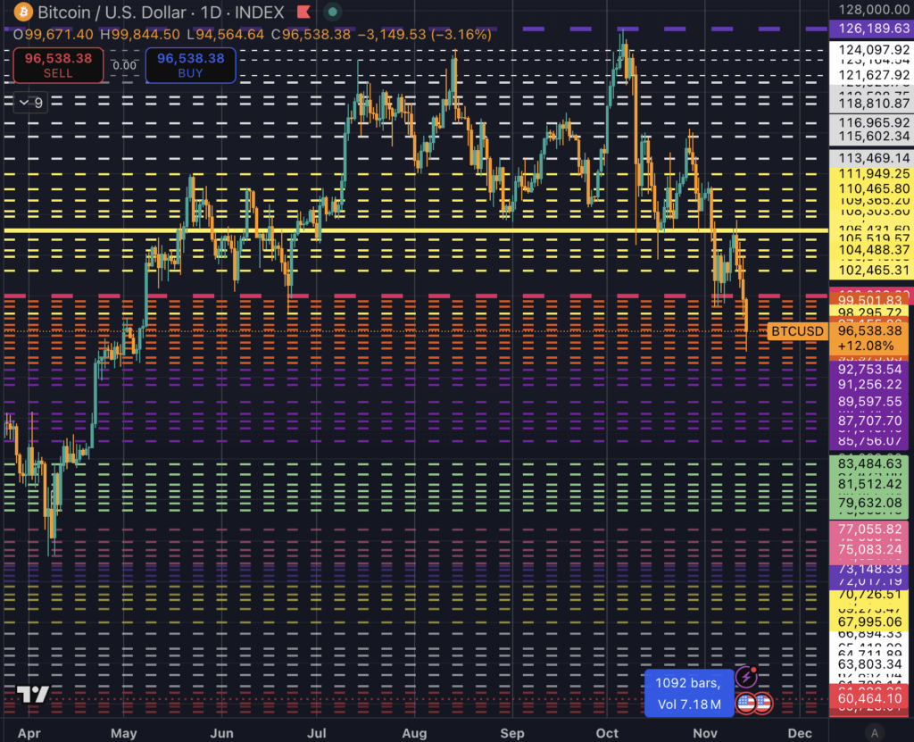 Each colored band represents a price range where Bitcoin spent time consolidating, indicating that leverage built up there and market participants anchored their decisions to those levels. Breaking through a channel requires meaningful pressure, whether it is buyers overwhelming sellers or the opposite.
